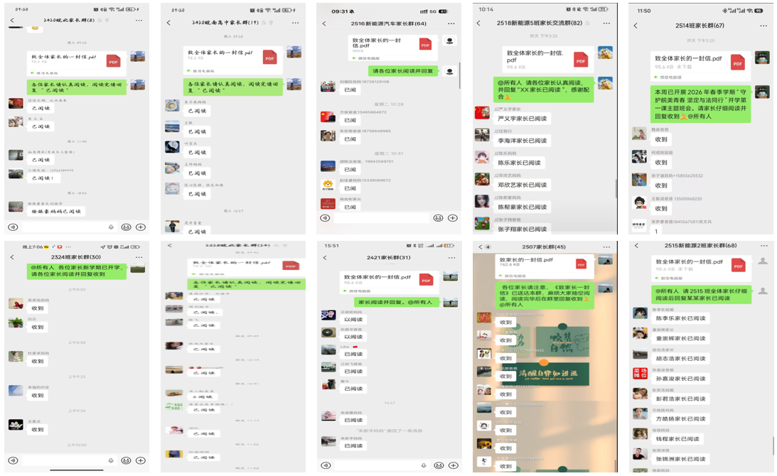 结合学生未来实习就业需求,班会融入《劳动法》《劳动合同法》相关知识,讲解劳动合同签订、劳动权益保障等实用内容,为学生职场维权筑牢法治基础。同时全面覆盖消防、交通、防电诈、禁毒、安全用电等安全要点,着重强调严禁违规骑行电摩等纪律要求,普及风险防范与自救技巧。各班还同步推送《致家长一封信》至家长群,督促家长阅读回复,压实家庭监护责任,搭建家校共育桥梁。