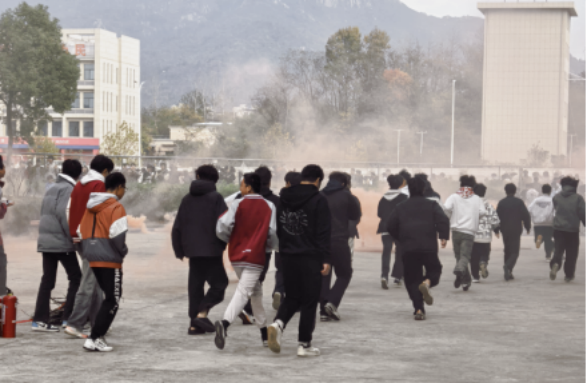 11月12日下午2点40分,随着校园消防警报急促响起,演习正式启动,男女生宿舍某楼层因电路短路“起火”,烟雾发生器迅速释放烟雾。演习总指挥通过广播发布疏散指令,班主任、教官等迅速到位,组织学生用湿毛巾捂住口鼻,弯腰低姿沿墙壁快速撤离至大操场,整个撤离过程井然有序。疏散演练结束后,又分系部组织了灭火演习。