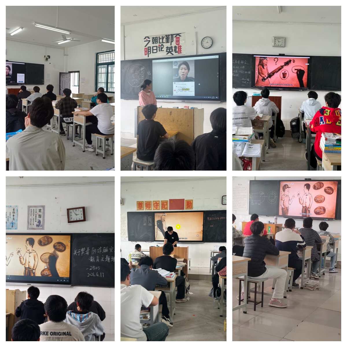 班主任围绕毒品治理新形势,讲解传统毒品与新型合成毒品特征,揭露伪装成食品、电子烟油的毒品陷阱,结合典型案例警示危害。各班统一观看禁毒宣传视频,深化珍爱生命、远离毒品理念。班会强调校园禁毒 “六不准”,普及风险识别、应急处置与依法求助技能。