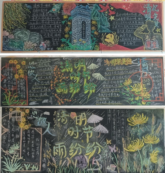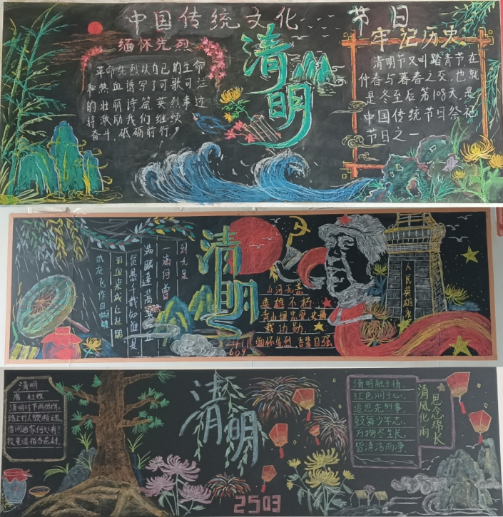 为传承弘扬中华优秀传统文化,深化清明节文化内涵与育人价值,引导学生铭记历史、缅怀先烈、敬畏生命,进一步丰富校园文化生活,3月24日至4月1日,学院团委面向全院34个班级,组织开展了“传统节日·清明节”主题黑板报评比活动。本次活动以“清明忆先贤·文化润青春”为主题,各系部高度重视、精心组织,全体班级积极响应、踊跃参与,用创意板报传递清明文化,以青春笔触致敬先贤先烈。