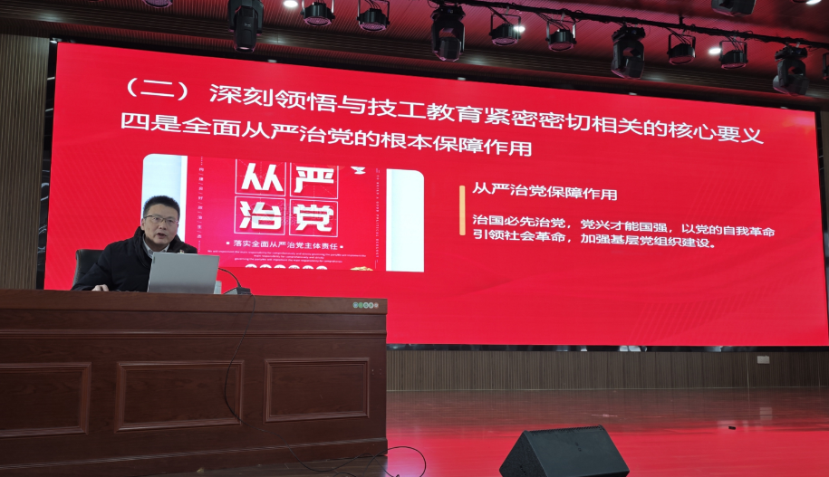 为深入学习贯彻党的二十届四中全会精神,切实把党员干部的思想和行动统一到党中央决策部署上来,推动党建工作与技工教育事业深度融合、同向发力,12月31日下午,安庆技师学院党委副书记、院长徐英武以《深学笃行二十届四中全会精神,筑牢技工院校党建与事业发展根基》为题,为学院党员干部讲课。学院党委委员、副院长徐波,党委委员、纪委书记朱清,党委委员严丰俊、张蕾等70余名在职党员聆听党课。